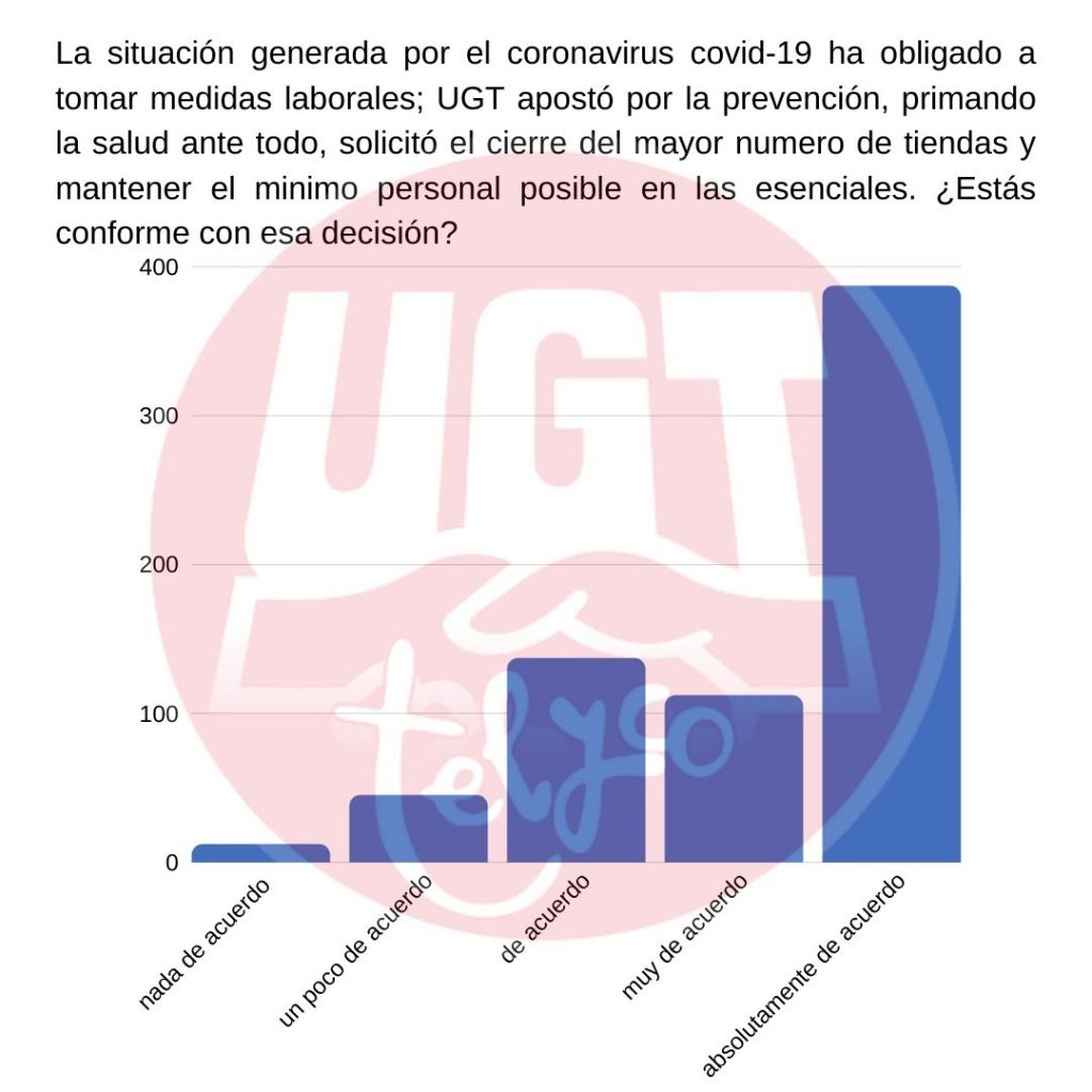 Desde UGT queremos agradecer a las más de 700 personas que habéis participado con vuestras respuestas en la encuesta que os hicimos llegar en días pasados, para que expresárais vuestra opinión de cómo se había actuado desde los distintos ámbitos de la empresa, para hacer frente a la crisis desatada por el Covid-19.